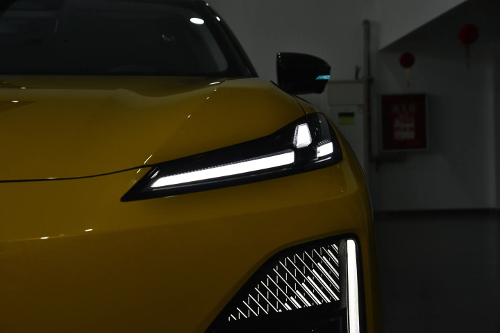 细节上,车型根据动力类型提供了两种前脸设计供选择。纯电版是较为简洁的弧面设计,线条流畅,车头两侧是立体感更强的引流槽,突出运动感;增程版本将灯组与引流槽融合整体感更强,车头下方是梯形进气口内部换装了网格中网,同样有着不错的运动氛围。